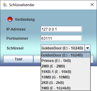 Zum Einrichten des Senders zur Übertragung eines Schlüssels muss der Menüpunkt Schlüssel senden ... angeklickt werden, woraufhin sich der Dialog zum Einrichten des Senders öffnet. |