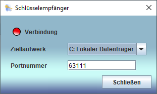 Während eines Empfangs leuchtet die LED grün und ein Fortschrittsbalken zeigt die Übertragung an. Würde der Schlüsselbund ohne Fehler empfangen wird er im Bundle-Ordner des ausgewählten Ziellaufwerks gespeichert und die Erfolgsmeldung angezeigt. |