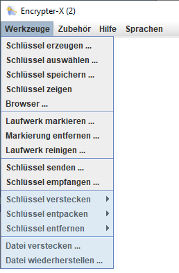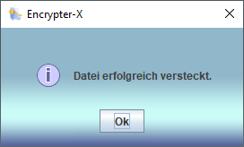 Schlüssel verstecken ... Schlüssel entpacken ... Schlüssel entfernen ... Datei verstecken ... Datei wiederherstellen ... |
