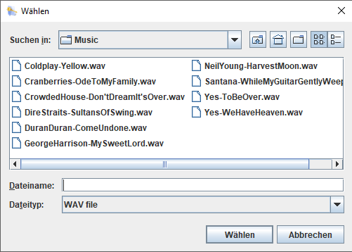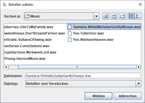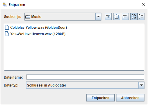 Genau so wie Schlüsselbunde können auch beliebige Dateien in Bildern oder Audiodateien versteckt bzw. eingewebt werden. Der Unterschied zwischen Schlüsselbündel und anderen Dateien liegt darin begründet, dass Schlüsselbündel etwas anders verwoben werden, damit die Schlüsselbundsuche sie von normalen Dateien unterscheiden kann. Beim Funktionsaufruf wird zunächst über einen Dateiauswahldialog die zu versteckende Datei erfragt und anschließend der zu verwendende Behälter. Angeboten werden hier sowohl Dateien des Formats WAV als auch PNG und zwar alle, die über die erforderliche Kapazität zur Aufnahme der zu versteckenden Datei verfügen. |