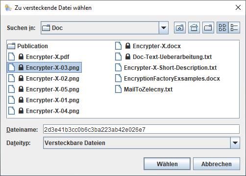 Um die versteckten Dateien wieder aus dem Behälter herauszuholen, ist die Funktion Datei wiederherstellen aufzurufen. Beim Funktionsaufruf wird über einen Dateiauswahldialog der zu entpackende Behälter erfragt. Angeboten werden hier nur Dateien die auch eine versteckte Datei enthalten. |