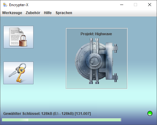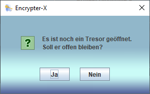 Sind einige Daten größer als die maximale Schlüssellänge aus dem aktuellen Schlüsselbund, liegt es in der Verantwortung des Anwenders, ob er zunächst einen anderen Schlüsselbund auswählen will oder die Verschlüsselung trotzdem mit dem aktuellen Schlüsselbund durchführen möchte. Ist der aktuelle Schlüsselbund bereits relativ groß und sind einige Dateien nur ein wenig größer, ist es eigentlich kein Problem, in diesen Fällen den verwendeten Schlüssel zyklisch zu verlängern. Wer es allerdings ganz genau nimmt mit OTP und ganz sicher gehen will, dass die Daten unentschlüsselbar verschlossen sind, der muss einen neuen Schlüsselbund generieren oder auswählen, dessen Schlüssel lang genug sind, um auch die größte der Dateien unverlängert zu verschlüsseln. Ist ein Tresor geöffnet und die Anwendung soll geschlossen werden, muss der Anwender erst bestätigen, dass die Anwendung auch bei geöffnetem Tresor geschlossen werden kann. Dadurch soll verhindert werden, dass Daten, die eigentlich unter Verschluss gehalten werden sollen, versehentlich unverschlüsselt im Arbeitsbereich verbleiben. |