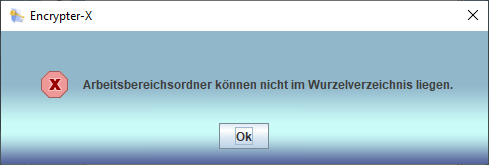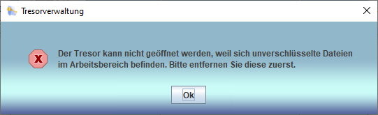 Durch einen Doppelklick mit der linken Maustaste auf die geschlossene Tresortür wird der Tresor geöffnet. Dies geht jedoch nur, wenn der definierte Arbeitsbereich vollkommen leer ist. Nach dem Schließen eines Tresors werden die unverschlüsselten Dateien und Ordner aus dem Arbeitsbereich entfernt und der Arbeitsbereich muss leer bleiben, bis die Dateien wieder entschlüsselt werden. Beim Versuch den Tresor zu öffnen, wenn zwischenzeitlich neue Dateien in den Arbeitsbereich kopiert wurden, erhält der Anwender eine Fehlermeldung und muss zunächst den Arbeitsbereich wieder entleeren. |