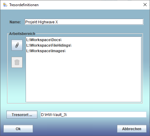 Es können verschiedene Tresore für verschiedene Projekte definiert werden und der Zusammenhang zwischen dem Tresorort, dem Arbeitsbereich und den beteiligten Dateien ist für jeden Tresor zu spezifizieren. Die Funktion dafür ist über den Hauptmenüpunkt Zubehör und den Menüpunkt Tresore ▶ Verwalten ... erreichbar. |