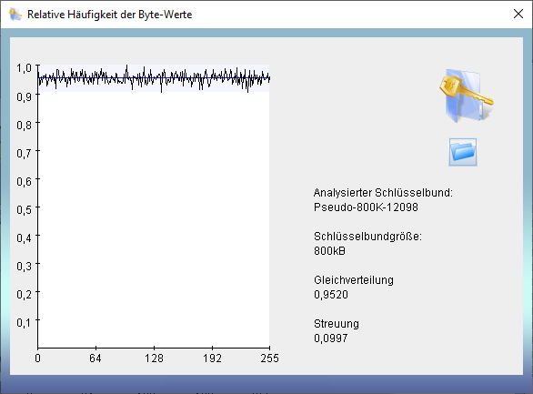Bei der Gleichverteilung wird betrachtet, ob in der Bytefolge eines Schlüsselbunds alle möglichen Werte zwischen 1 und 255 gleich häufig vorkommen. Dazu werden die Häufigkeiten ermittelt und auf die maximale Häufigkeit normiert, so dass es sich immer um Werte zwischen 0.0 und 1.0 handelt. Sodann wird der Mittelwert (blaue horizontale Linie) aller Häufigkeiten gebildet, der dann die Gleichverteilung darstellt. Je näher dieser Wert bei 1.0 liegt, desto besser ist die Ausgeglichenheit in diesem Schlüsselbund. Um zu beurteilen, ob es trotz eines guten Gleichverteilunswertes einige Ausreißer gibt, also einige Bytewerte dabei sind, die unterrepräsentiert sind, wird zusätzlich die Differenz zwischen der maximalen und minimalen, relativen Häufigkeit gebildet. Diese Streuung sollte dann nach Möglichkeit nahe bei 0.0 liegen. |