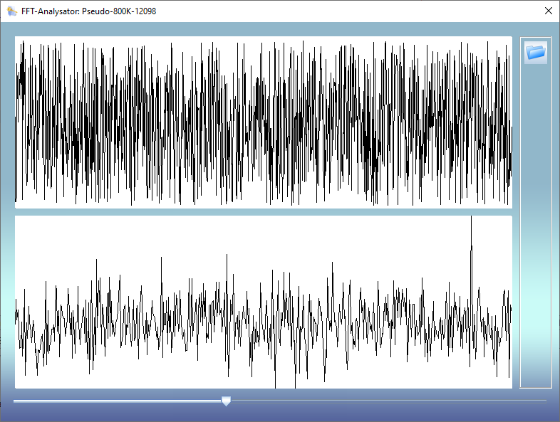 Eine Bytefolge mit zufälligen Werten entspricht dem, was aus der Akustik als weißes Rauschen bekannt ist. Führt man mit einem solchen Signal (Verlauf im oberen Teil der Abbildung unten) eine Fast-Fourier-Analyse (FFT) durch, ist das resultierende Spektrum (Verlauf im unteren Teil) genau so "verzapplet" wie das Signal selber. Dargestellt werden jeweils 1024 Werte eines Schlüsselbunds und das resultierende Spektrum. Mit dem Schieberegler (unten) läßt sich der Anfang der 1024 Byte über den gesamten Schlüsselbund verschieben. Außer den Schlüsselbunddateien lassen sich auch Dateien vom Typ WAV laden. Es liegen im Ordner "FFT-Testwaves" einige WAV-Dateien mit reinen Sinustönen, die veranschaulichen, wie die Spektren periodischer Verläufe im Gegensatz zu Signalen mit zufälligem, weißen Rauschen aussehen. |