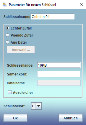 Wer da besonders vorsichtig ist und lieber auf Nummer sicher gehen will, kann aber auch die Option Pseudo Zufall wählen. Die hierdurch erzeugten pseudo-zufälligen Bytefolgen lassen sich reproduzieren durch Verwendung des selben Samenkorns und man muss sich nur dieses Samenkorn merken, um solche Schlüsselbunde zu reproduzieren. Einen solchen Schlüsselbund zu verwenden ist aber auch extrem sicher, denn es gibt 18.446.744.073.709.551.615 Samenkörner, die alle zu verschiedenen, pseudo-zufälligen Bytefolgen führen und Untersuchungen haben gezeigt, dass Bytefolgen, bei denen sich die Samenkörner um nur eins unterscheiden, vollkommen verschieden sind. Zusätzlich lassen sich noch Schlüsselbunde über die Option Aus Datei aus beliebigen Dateiinhalten generieren. Diese sind zwar reproduzierbar, aber auch nur solange die Quelldateien gepflegt werden und verfügbar sind. Diese Option ist eigentlich mehr akademischer Natur und sollte für ernsthaftes und notwendig, wichtiges Verschlüsseln nicht in Betracht kommen. Die Ausgleicher Option sorgt vor allem bei kleineren Schlüsselbunden dafür, dass Bytewerte, die viel weniger in der Bytefolge auftauchen, durch einen Teil der häufiger auftauchenden Bytewerte ersetzt werden, was die Gleichverteilung der zufälligen Bytewerte erhöht. Da die Gleichverteilung als eines der Qualitätsmerkmale der Schlüsselbunde verwendet wird, erhöht sich deren Qualität dadurch natürlich. Ob die Schlüssel aber dadurch wirklich zufälliger werden sei dahin gestellt. Immerhin sind sie sowieso schon absolut zufällig. Zu guter Letzt muss noch das Ziel, der Schlüsselort, für den neu erstellten Schlüsselbund angegeben werden. Hier stehen die aktuell verfügbaren Laufwerke zur Auswahl. Auf dem ausgewählten wird der Schlüsselbund in einem Ordner namens Bundle gespeichert. |