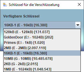 Ein Schlüsselbund muss ausgewählt sein, damit überhaupt Verschlüsselungen möglich sind. Sind noch keine Schlüsselbunde verfügbar, müssen zuerst welche erzeugt werden oder externe Medien (USB-Stick, SD-Karte, o.ä.) angeschlossen werden, die Schlüsselbunde enthalten. Ohnehin ist anzuraten, Schlüsselbunde nicht auf dem Rechner selbst aufzubewahren oder vorzuhalten. Sobald Encrypter-X gestartet ist, läuft ein Hintergrundprozess, der etwa alle 10 Sekunden einen Suchlauf nach vorhandenen Schlüsselbündeln durchführt. Während der Suche leuchtet die grüne LED in der linken unteren Ecke. Alle Schlüsselbündel, die dabei gefunden werden, können dann zur Verschlüsselung ausgewählt werden. Für die Entschlüsselung müssen Schlüsselbunde nicht extra ausgewählt werden. Es genügt, wenn sie bei der Suche gefunden wurden. Um einen Schlüsselbund auszuwählen, wählen Sie den Menüpunkt Schlüssel auswählen .... Ein Dialogfenster öffnet sich und bietet in einem Kombinationsfeld alle verfügbaren Schlüsselbunde zur Auswahl an. |