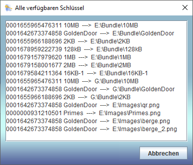 Jeder Schlüsselbund besitzt eine eindeutige Identifikationsnummer (ID). Befinden sich Kopien eines Schlüsselbunds auf verschiedenen Medien, werden diese zwar alle bei der Schlüsselbundsuche gefunden, bei der Schlüsselbundauswahl wird aber ein Schlüsselbund nur einmal angezeigt. Die Funktion Schlüssel zeigen zeigt aber in einer Liste alle Schlüsselbündel, die auf den angeschlossenen Medien gefunden wurden. |
