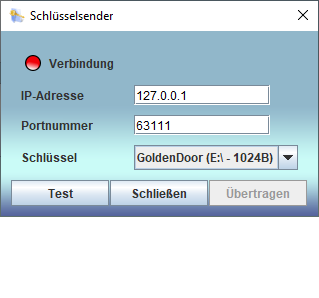 Zum Einrichten des Senders zur Übertragung eines Schlüssels muss der Menüpunkt Schlüssel senden ... angeklickt werden, woraufhin sich der Dialog zum Einrichten des Senders öffnet. |