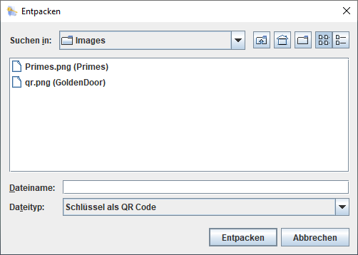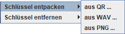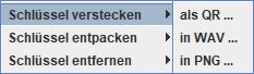 Schlüsselbunde können in Dateien mit den Dateiformaten PNG und WAV "versteckt" oder in einem QR-Code abgelegt werden. Wird eine dieser "Behälterdateien" ausgewählt, wird der aktuell ausgewählte Schlüsselbund in diesem Behälter "verpackt". Die Funktionen dafür sind über den Hauptmenüpunkt Werkzeuge und das Menü Schlüssel verstecken erreichbar. |