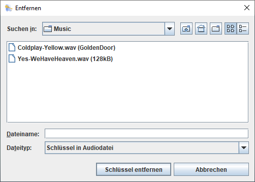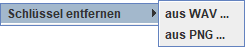 Schlüsselbunde lassen sich auch aus ihren Behältern entfernen. Dies ist aber nur für die Formate PNG und WAV erforderlich, denn QR-Codes können einfach gelöscht werden. Die Funktionen dafür sind über den Hauptmenüpunkt Werkzeuge und das Menü Schlüssel entfernen erreichbar. |