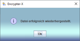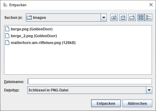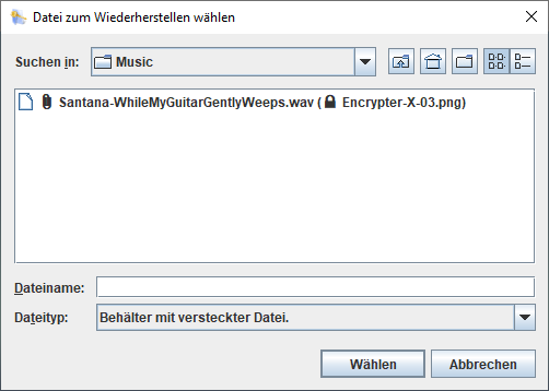 Um die versteckten Dateien wieder aus dem Behälter herauszuholen, ist die Funktion Datei wiederherstellen aufzurufen. Beim Funktionsaufruf wird über einen Dateiauswahldialog der zu entpackende Behälter erfragt. Angeboten werden hier nur Dateien die auch eine versteckte Datei enthalten. |