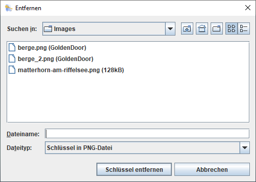 Schlüssel verstecken ... Schlüssel entpacken ... Schlüssel entfernen ... Datei verstecken ... Datei wiederherstellen ... |