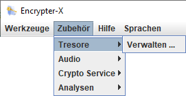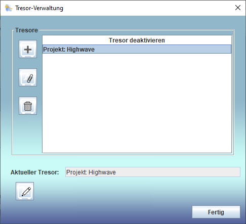 Es können verschiedene Tresore für verschiedene Projekte definiert werden und der Zusammenhang zwischen dem Tresorort, dem Arbeitsbereich und den beteiligten Dateien ist für jeden Tresor zu spezifizieren. Die Funktion dafür ist über den Hauptmenüpunkt Zubehör und den Menüpunkt Tresore ▶ Verwalten ... erreichbar. |