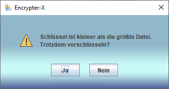 Sind einige Daten größer als die maximale Schlüssellänge aus dem aktuellen Schlüsselbund, liegt es in der Verantwortung des Anwenders, ob er zunächst einen anderen Schlüsselbund auswählen will oder die Verschlüsselung trotzdem mit dem aktuellen Schlüsselbund durchführen möchte. Ist der aktuelle Schlüsselbund bereits relativ groß und sind einige Dateien nur ein wenig größer, ist es eigentlich kein Problem, in diesen Fällen den verwendeten Schlüssel zyklisch zu verlängern. Wer es allerdings ganz genau nimmt mit OTP und ganz sicher gehen will, dass die Daten unentschlüsselbar verschlossen sind, der muss einen neuen Schlüsselbund generieren oder auswählen, dessen Schlüssel lang genug sind, um auch die größte der Dateien unverlängert zu verschlüsseln. Ist ein Tresor geöffnet und die Anwendung soll geschlossen werden, muss der Anwender erst bestätigen, dass die Anwendung auch bei geöffnetem Tresor geschlossen werden kann. Dadurch soll verhindert werden, dass Daten, die eigentlich unter Verschluss gehalten werden sollen, versehentlich unverschlüsselt im Arbeitsbereich verbleiben. |