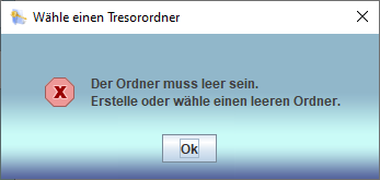 Durch einen Doppelklick mit der linken Maustaste auf die geschlossene Tresortür wird der Tresor geöffnet. Dies geht jedoch nur, wenn der definierte Arbeitsbereich vollkommen leer ist. Nach dem Schließen eines Tresors werden die unverschlüsselten Dateien und Ordner aus dem Arbeitsbereich entfernt und der Arbeitsbereich muss leer bleiben, bis die Dateien wieder entschlüsselt werden. Beim Versuch den Tresor zu öffnen, wenn zwischenzeitlich neue Dateien in den Arbeitsbereich kopiert wurden, erhält der Anwender eine Fehlermeldung und muss zunächst den Arbeitsbereich wieder entleeren. |